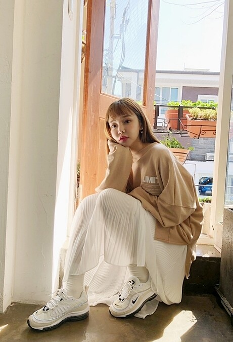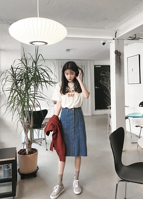 帶有英文字樣的短袖上衣,不論是 Logo 設計或者簡約圖騰,是近期夯到不行的款式,再搭配的選擇上,混搭牛仔長裙、西裝套裝,立即展現街頭的時髦造型。