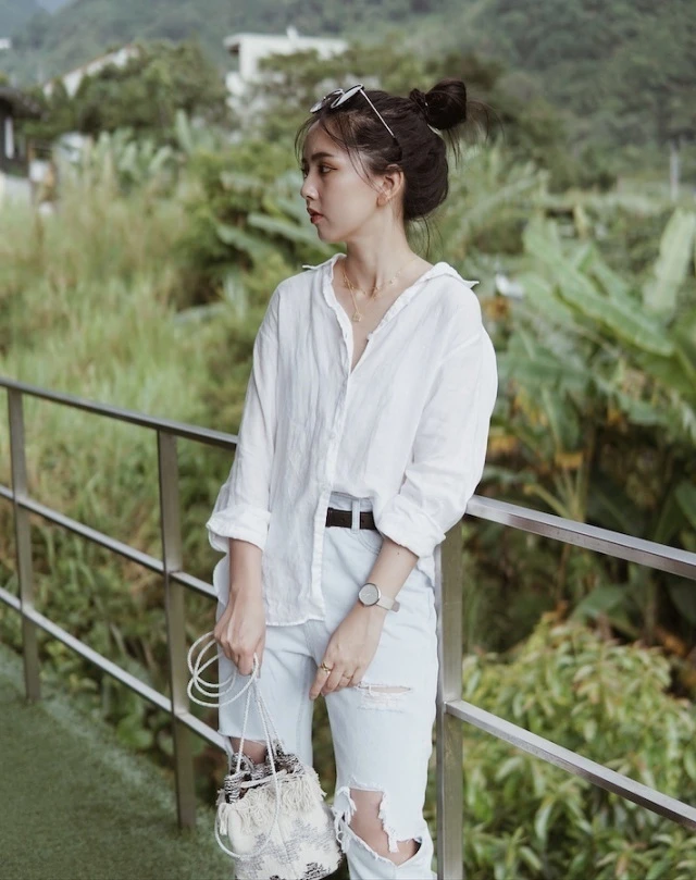 有點中性的打扮換換不同味道,透膚的棉麻襯衫、讓大腿散熱的破褲,雖是 boyfriend look,但性感未失。