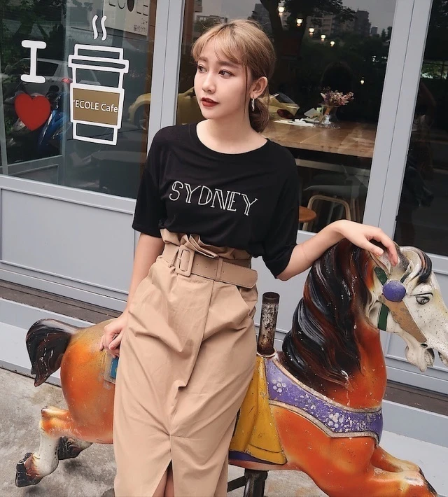 上身輕鬆休閒T恤、下身精明幹練長版窄裙卻是無違和搭配,像是告訴男友:我可成熟、也可小女人。