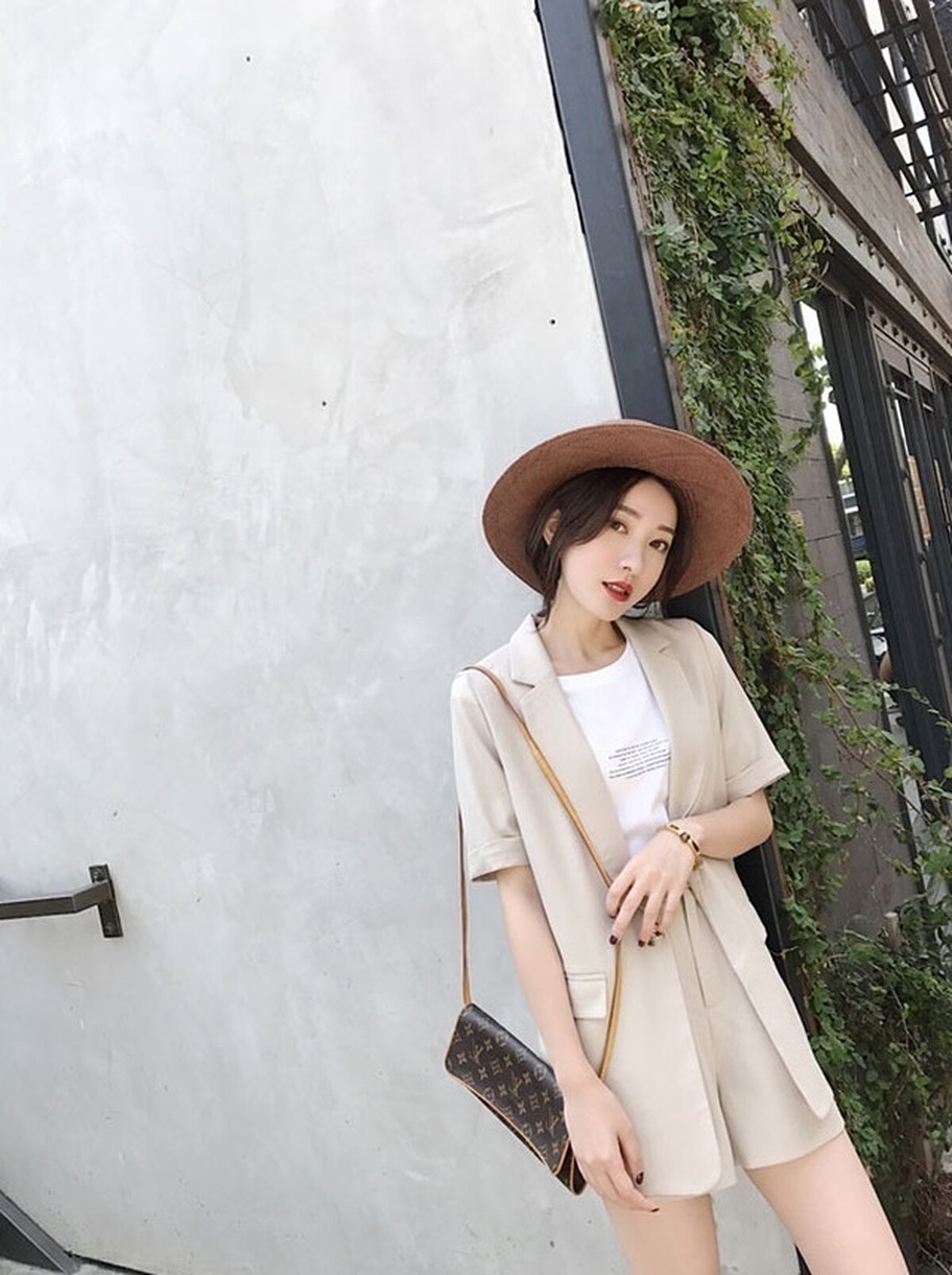 畢竟夏天還沒過完,雖然想要穿搭好看但是太厚重的西裝外套也只能在冷氣房裡才穿得住,這時候就可以選擇短袖款式的西裝外套,裡面一樣可以搭配簡單的 T 恤就好了。