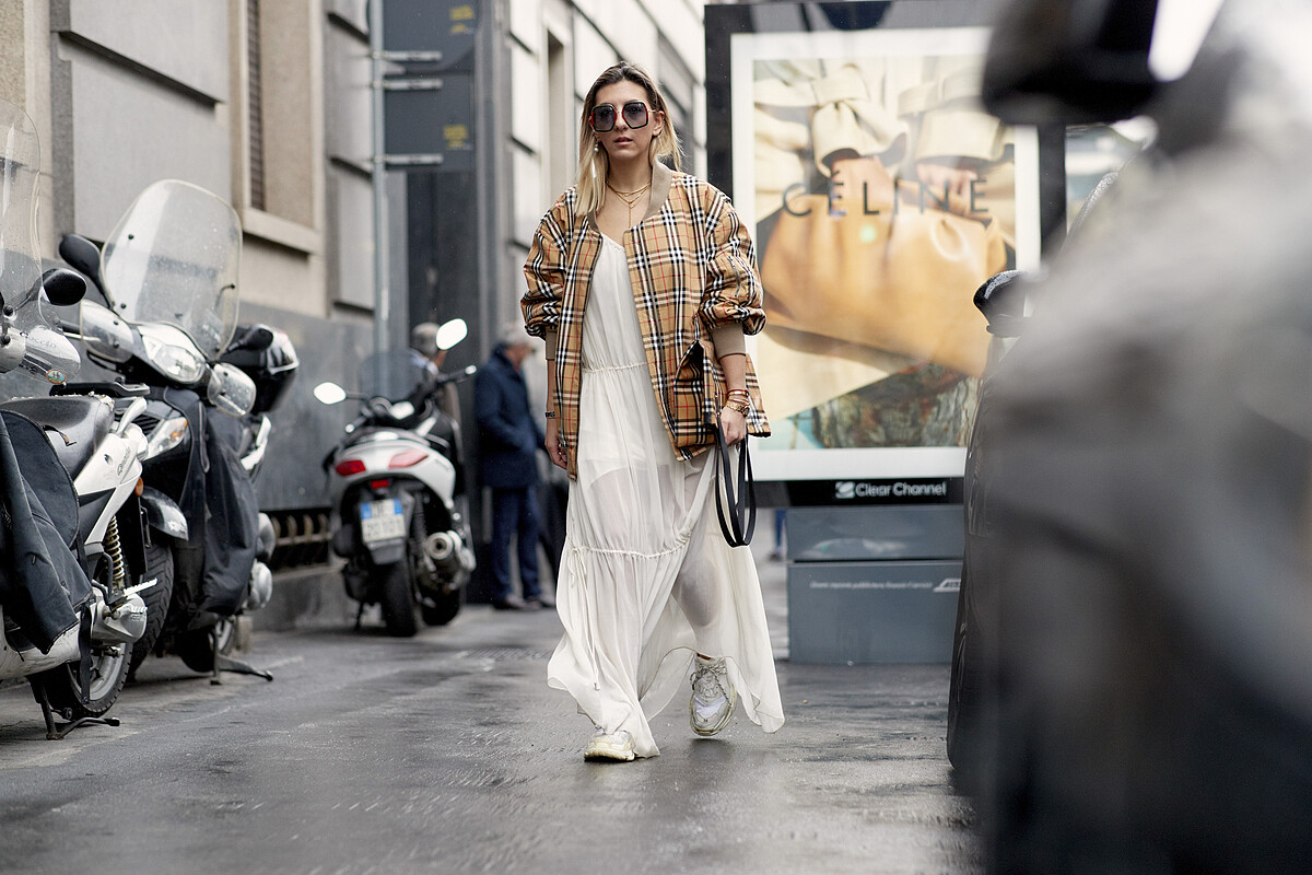 若是碰上鞋舌或是鞋背設計較為高、碰至腳踝以上的,那麼像迷你剪裁的短洋裝則可還原腿部的修長比例。