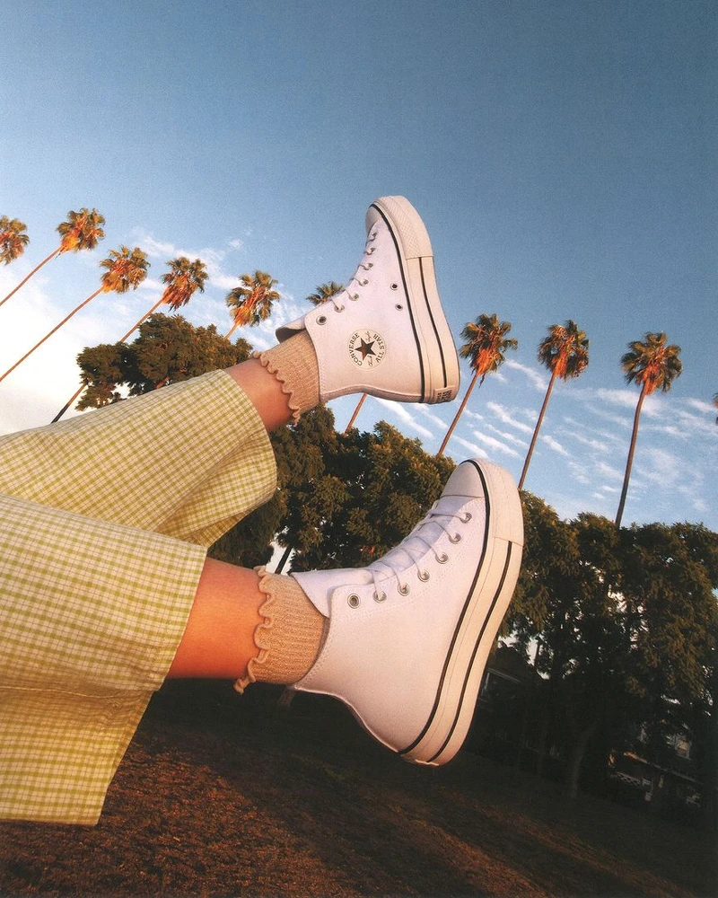Converse在2023年秋季以「玩心匡不住」為主題推出的全新鞋款,將經典的Chuck Taylor All Star及Chuck 70融入滑板文化元素,像是寬厚的大底與解構細節等,打造甜酷風格的「悠遊All Star」和街頭滑板風格Chuck 70季節新款,全白的設計中以不同皮革的拼接打造出色系的層次感,高約3公分的大底,也能拉長腿型與身形比例喔。