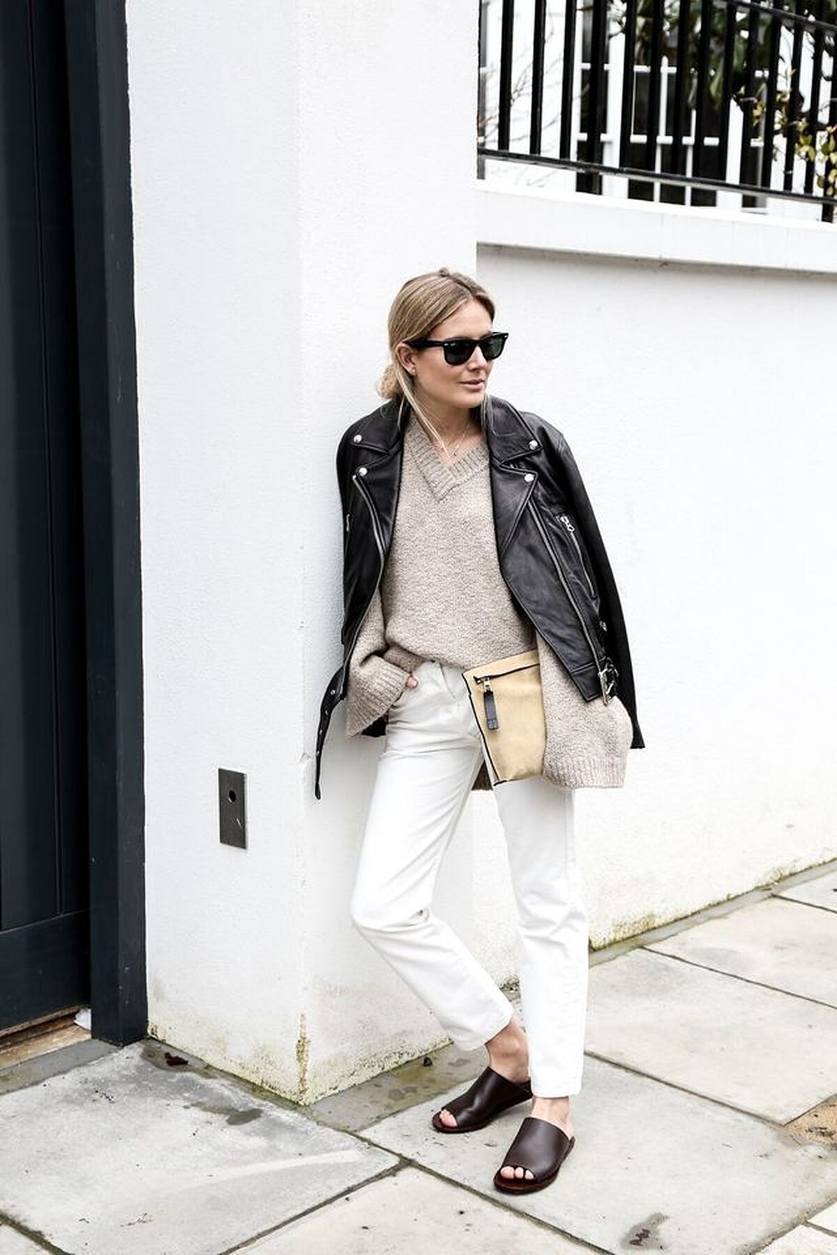 ▲ 黑色皮衣總容易帶給人一種冷漠的距離感,但只要內搭選擇淺色系就能調和下太帥氣的感覺!例如稍微寬鬆的 V 領淺杏色毛衣,可以配上一樣是淺色系的白色直筒牛仔褲,接著選用深咖啡色的拖鞋,打破以往覺得皮衣就是要配靴子或高跟鞋的印象!