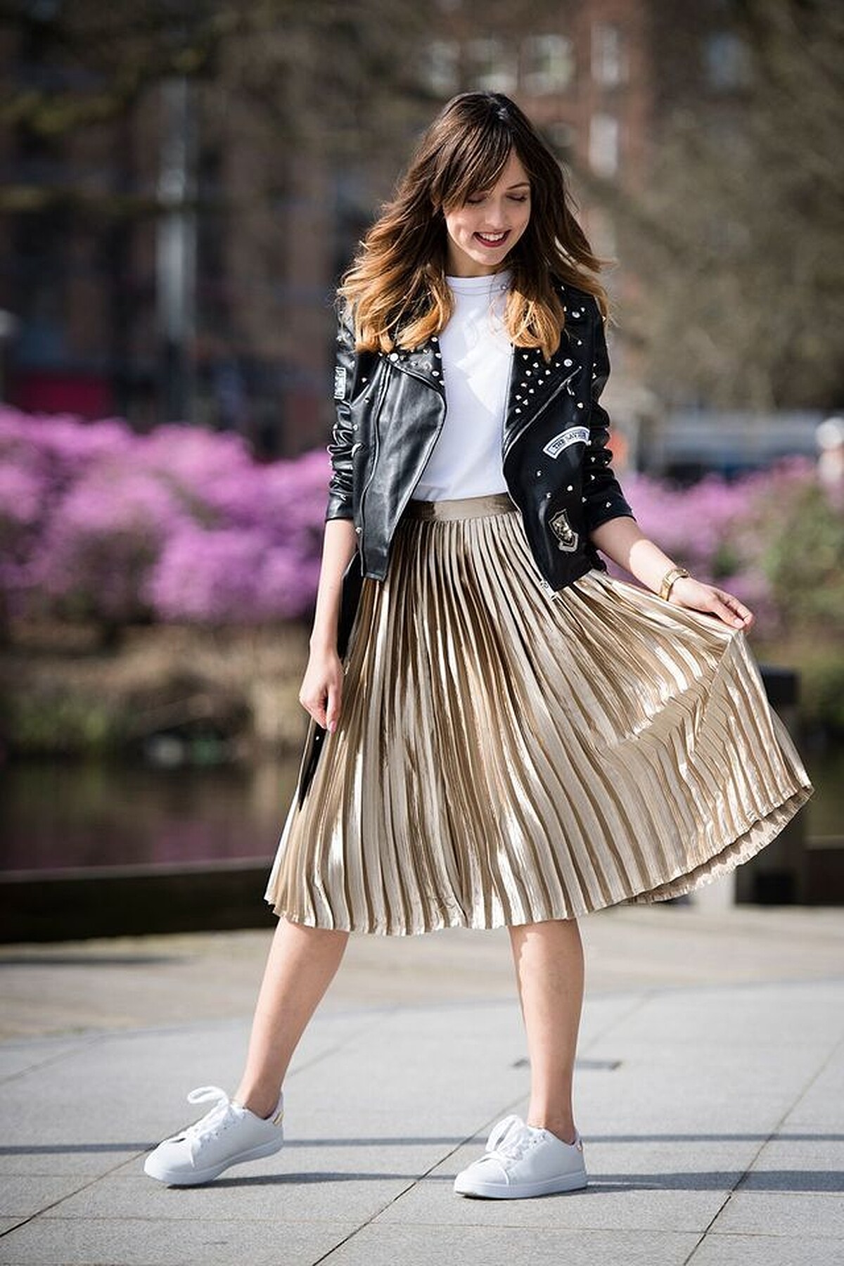 ▲ 厭倦皮衣的帥氣感了嗎?來試試跳脫框架來件甜美的百褶裙吧!雖然圖上的皮衣因為鉚釘而帶出了龐克搖滾風,但白色的平底鞋,和金色的百褶即膝裙,卻反而使整體營造出學生的青春氣息感!不會給人太過強悍的感覺!