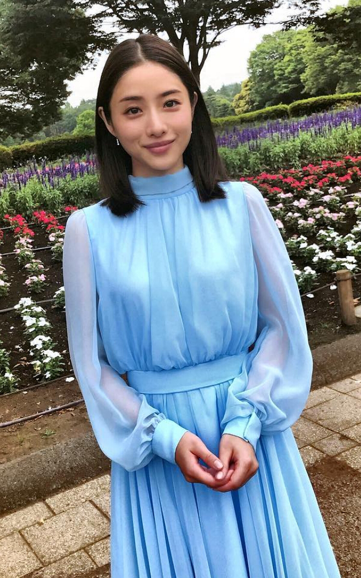 ▲ 石原成功駕馭讓人過目不忘的藍色雪紡皺摺洋裝!