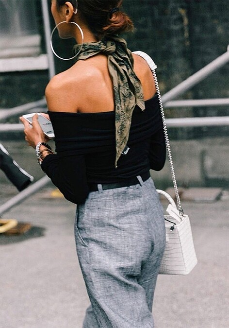 ▲ 大部分的人會將領巾結打在胸前,但其實穿著露背上衣時,可將領巾往後拉,達成真正的背影殺手!另外記得也要將頭髮梳起,否則就看不到你想露出的領巾了!