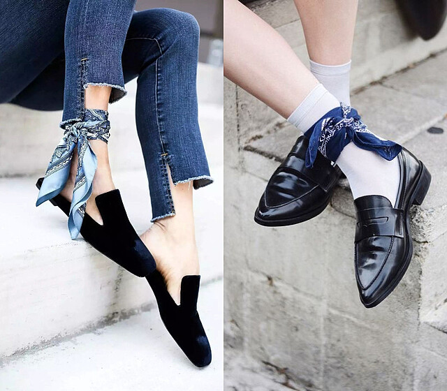 ▲ 捨棄金屬飾品,來試試將領巾綁在腳踝上看看吧!回頭率保證 100%!又或者可以像右圖一樣,樂福鞋加上襪子與領巾的組合,這樣學院風十足啊!領巾適用的範圍比想像中還多很多呢!