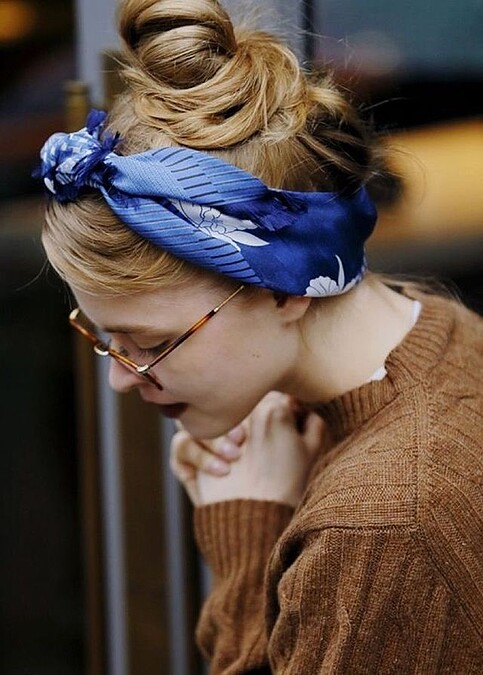 ▲ 綁起頭髮時也能將領巾當成髮飾,增加造型的時尚度!搭編覺得丸子頭超適合!