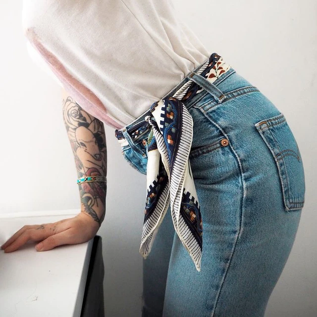 ▲ 家裡的皮帶看膩了?利用領巾來呈現不一樣的感覺吧!簡單,卻又多了隨興與率性的感覺,而且不想綁在腰間上時,還能立馬解下來綁在包包上或是收起來,這可是一般皮帶做不到的呀!