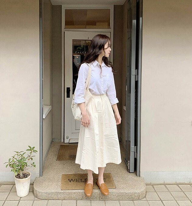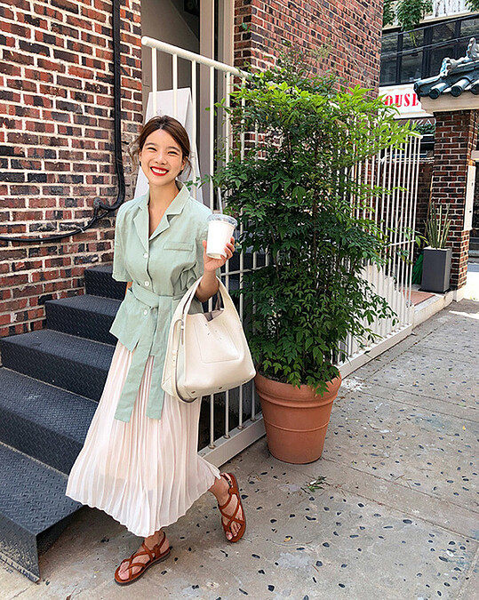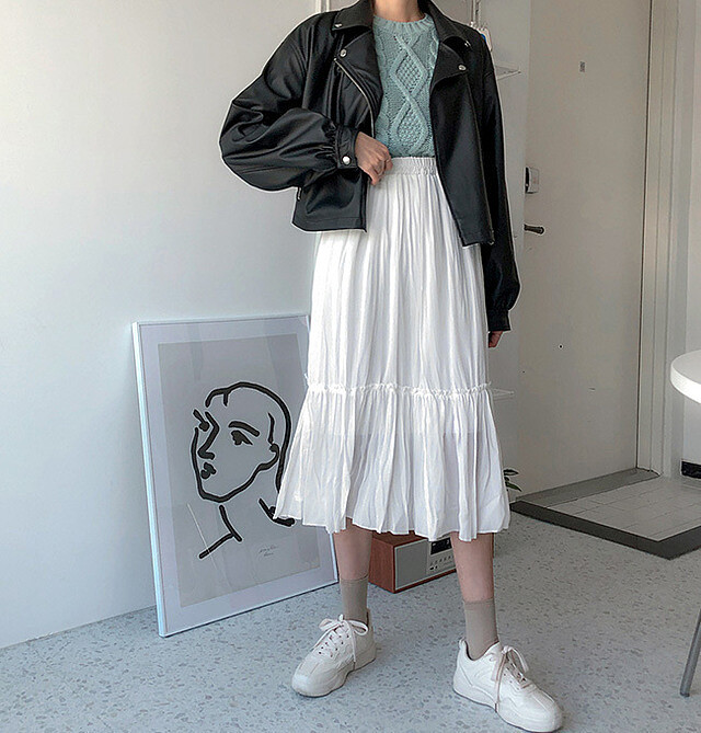 有在追隨韓國春搭的女孩應該會發現春季出了不少長裙,畢竟在早晚溫差大的春季要穿著短裙還稍嫌早,長裙會是不少少女在春季的選擇,這時候梨型女孩除了避開會貼臀的針織、棉布料外,其實可以嘗試看看造型十足的皺皺裙、百褶裙、蛋糕裙...等,能讓注意力轉移,讓焦點集中在單品設計上,尤其是皺皺裙更是這季不可或缺的單品之一。