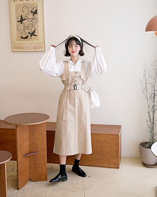 如果是害羞不習慣露腿的女孩也有不少長裙可以選擇,像是較硬挺的卡其布料最能修飾臀部線條,除了修身效果第一外,也是很常在日本雜誌中看到的萬年百搭單品之一。另外像是歐膩選擇的卡其連身裙有腰帶設計的小巧思,在視覺上達到整體比例拉長的效果,相當適合嬌小個子的女孩。