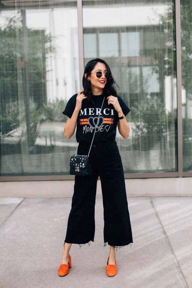 穿著寬褲時能利用同色系來達到拉長腿部比例的效果,且黑色還能顯瘦,也更能修飾梨型女孩的下半身。如果身材較為矮小的女孩記得露出多一點的腳踝,並穿上跟鞋營造是高個的錯覺感!另外與其背大包包,搭編更建議選擇小包包,才不會使整個人看起來太過沉重!