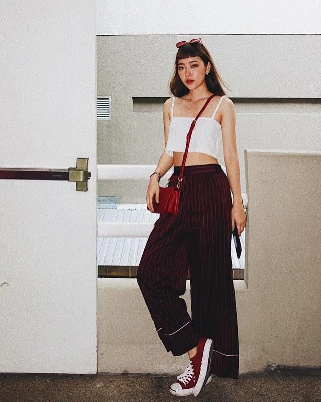 喜歡個性辣妹風的話,可以選擇細肩短版背心露出腰部與肩部,配上高腰寬褲後就不會顯得太過裸露或讓人覺得情色,且高腰和直條紋的設計也有拉長身型的效果!少見的紅色系穿搭也絕對能使你從人群中跳脫出來!如果不喜歡太過招搖,沉穩的酒紅色也是不錯的選擇!穿上布鞋後街頭感十足,也很適合穿著這樣去熱帶國家旅遊呢!