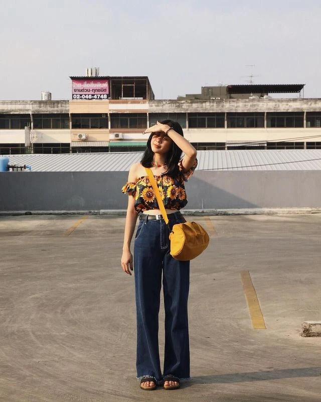 滿版向日葵圖樣的平口上衣配上直筒寬褲後,復古味十足!搭黨們可以記住短版上衣是最適合搭配寬褲的單品,把握上窄下寬的原則就不會使身型變得很奇怪!偷偷和大家再說個拍照小技巧,如果對於看著鏡頭會感到尷尬的話,像麻豆一樣用手假裝遮著陽光閉起眼睛會看起來很自然!