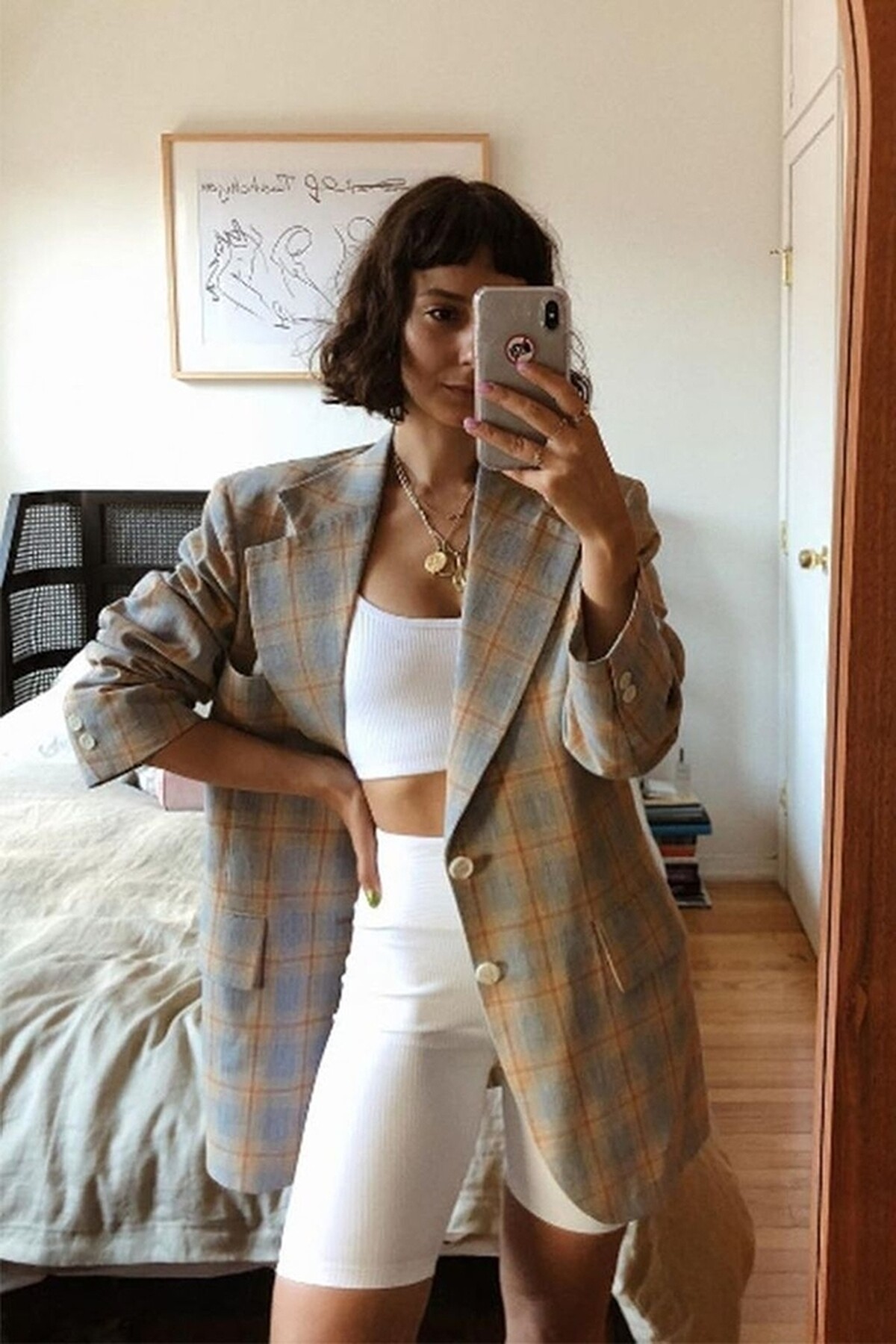 這絕對是現今最新潮的搭法!單車褲在 2018 年時又重返流行,但是大部分的人皆認為單車褲很難穿搭,不過搭上西裝外套後絕對讓你非常驚豔!身高僅為 155 公分的時尚編輯Alyssa Coscarelli 利用同色系的短板針織上衣搭配單車褲,配上寬鬆的格紋襯衫就能拉常比例!項鍊則是選擇近年來也很流行的硬幣項鍊!淺色系穿搭是屬於比較優雅的風格!