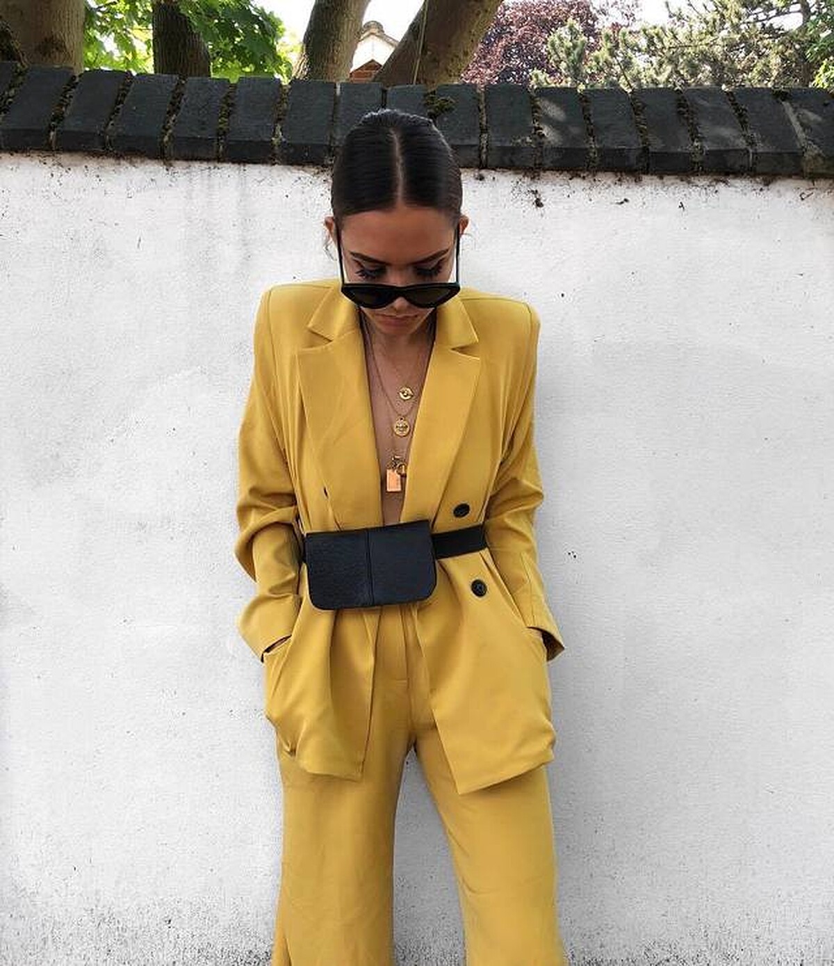 看似較鮮豔活潑的芥末黃西裝套裝,加上腰包後帥氣度立馬上升!大膽一點的搭黨可以甚至連內搭都不要穿,直接利用低胸打造性感與率性兼具的品味,套裝穿膩的人能夠選擇這種方式,來幫舊有的西裝套裝詮釋出新的風格!不過這種方式比較適合小胸部的人穿!