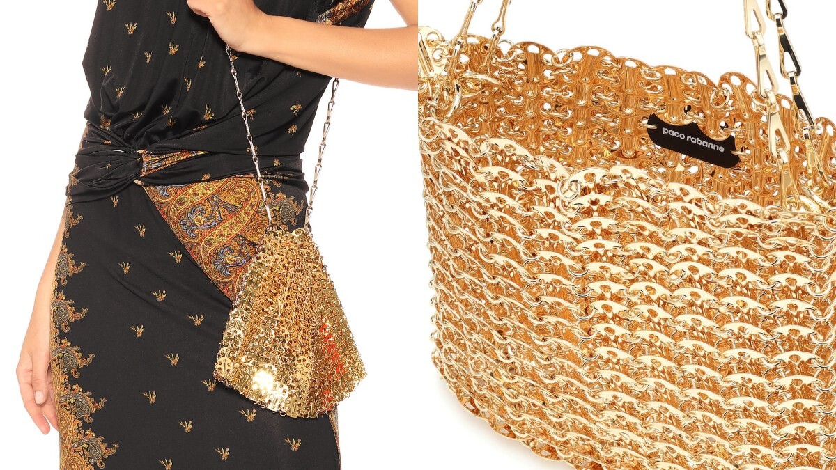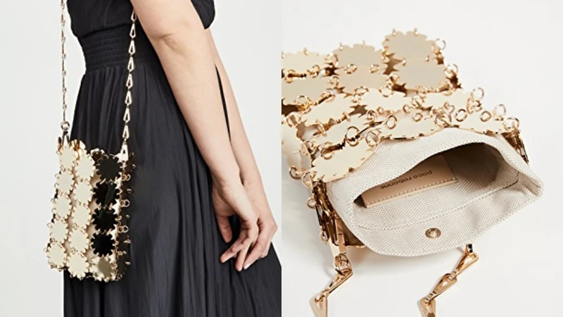 喜愛甜美風的則可參考這顆由西班牙設計師Paco Rabanne設計的花銅片手袋。一向擅長將金屬、塑膠、玻璃等硬質素材運用於服飾設計上的Paco Rabanne,不僅有著獨具的美學視角,更將這些冰冷的元素把玩的時髦又生動,而這一顆以花朵輪廓銅片拼接而成的鍊帶包則是典範之一,更成為時尚Icon們的璀璨選擇!內襯的帆布小袋則為整體添上度假氛圍,完美抓住相異風格間的平衡點。(售價約NT27,585)