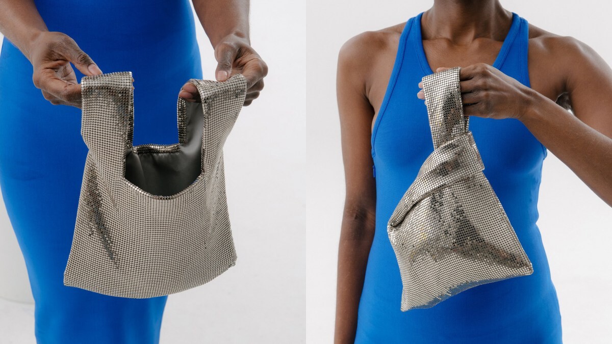 又或者改以銀色網製作而成的手提袋,簡約之中又帶有強烈的奢華質感。造型使用上除了和一般手袋採用手提方法外,也可將手提袋的其中一端穿越至另一端,形成宛如晚宴包的形式概念。(售價約NT15,345)