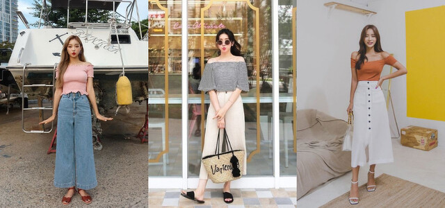 梨型身材的肩膀比較窄,小於臀寬,所以視覺上就會有屁股大的感覺。而一字領會有放大肩寬的效果,視覺上橫向延伸,讓肩看起來與臀部同寬。另外,同樣會讓肩變寬的細肩背心、削肩背心都是不錯的選擇。
