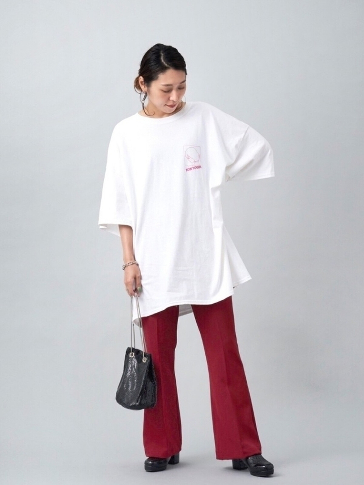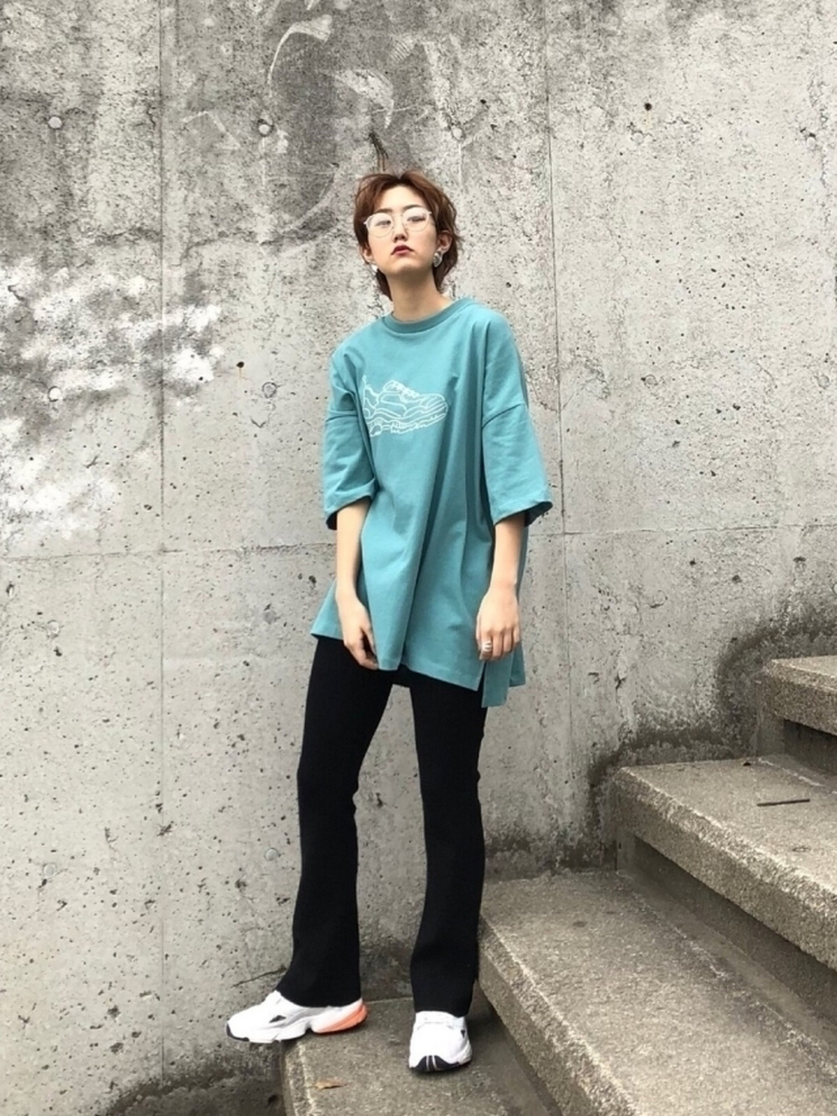 從膝蓋處向外延伸的喇叭線條,不僅能修飾大腿的顯瘦度,還能將肉肉的小腿一併遮掩,當想營造率性的休閒印象時,以 Oversize Tee 的造型組合,簡單營造日系的街頭個性。