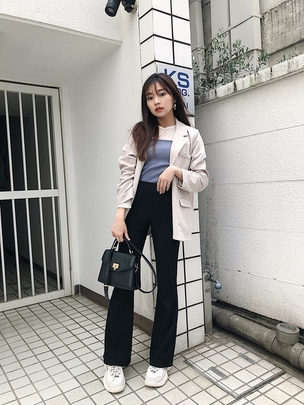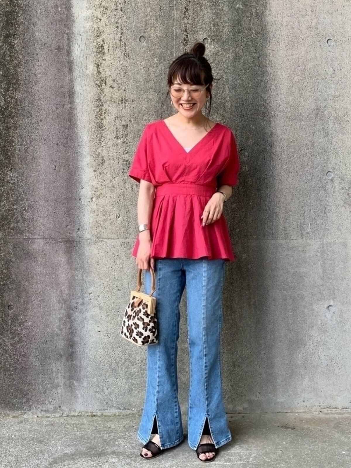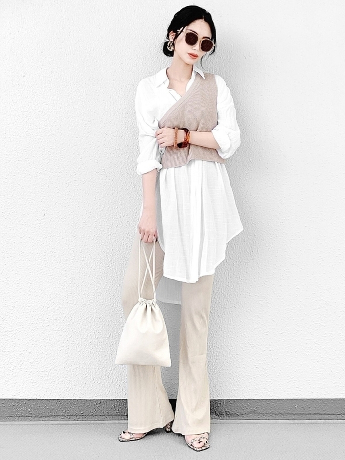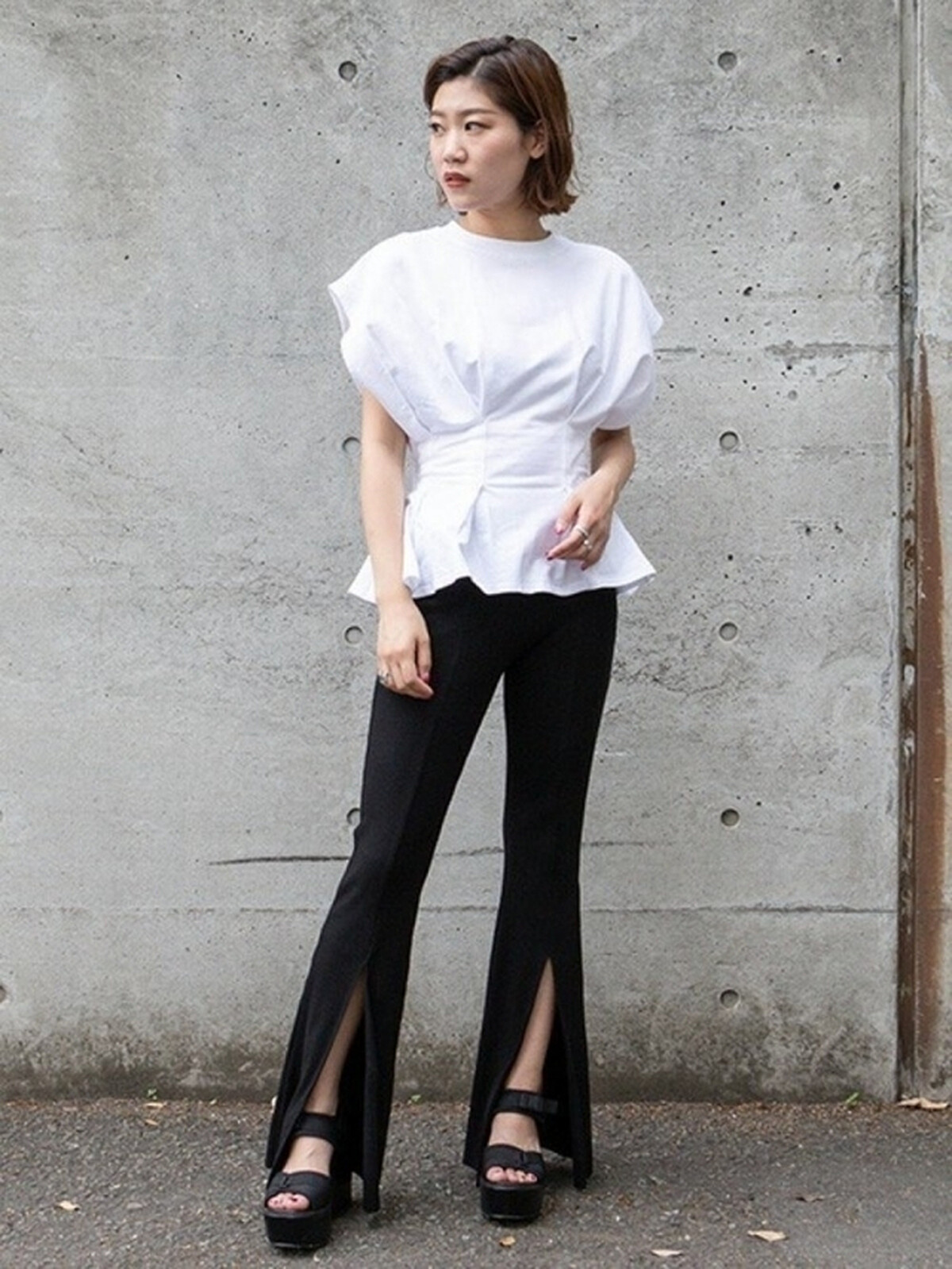 小喇叭褲除了能使腿部看起來修長,利用褲管開衩剪裁還能打造纖細感,選搭收腰設計的魚尾上衣與高跟涼鞋,讓你立即穿出 +5cm 的挑高視覺,同時營造微辛的女子魅力。