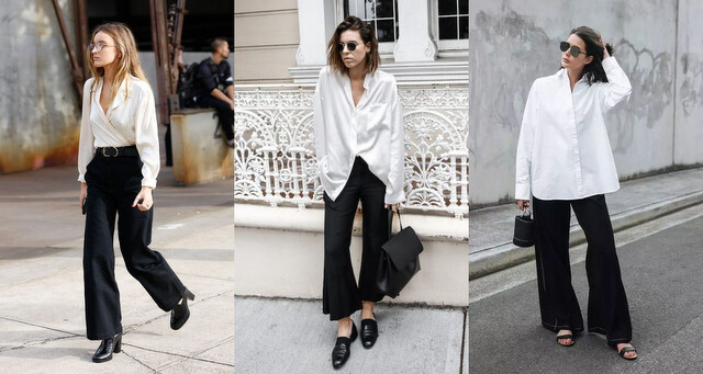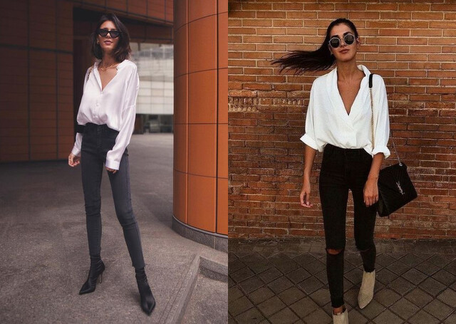 雖然近年大勢是寬褲,但窄管褲還是很需要的,窄管褲來搭上白襯衫不但展現了女生的性感曲線,整體穿搭幹練又俐落,如果你是扁屁股的女孩,可以選擇有屁股有口袋設計的窄管褲,如此便有些微的提臀效果,也能讓扁屁股看起來比較有份量,而像圖中穿上與褲款同色的尖頭靴,同色 + 尖頭這個小技巧可以讓你的雙腿有無限延伸的奇效。