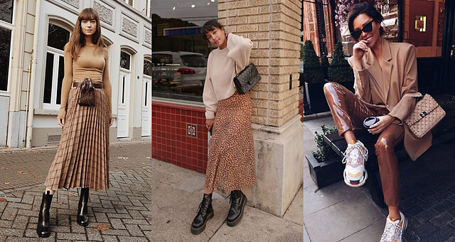 如果認為裸色穿搭稍嫌無趣,也可以利用具有格紋、波點、豹紋等等紋路的單品搭配,讓穿搭多了豐富的細節變化,或是配上緞面、皮革等等搶眼的異材質單品來聚焦,也是很棒的選擇。