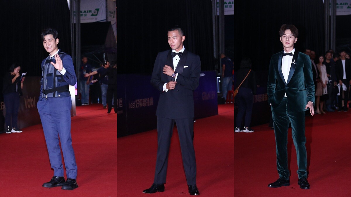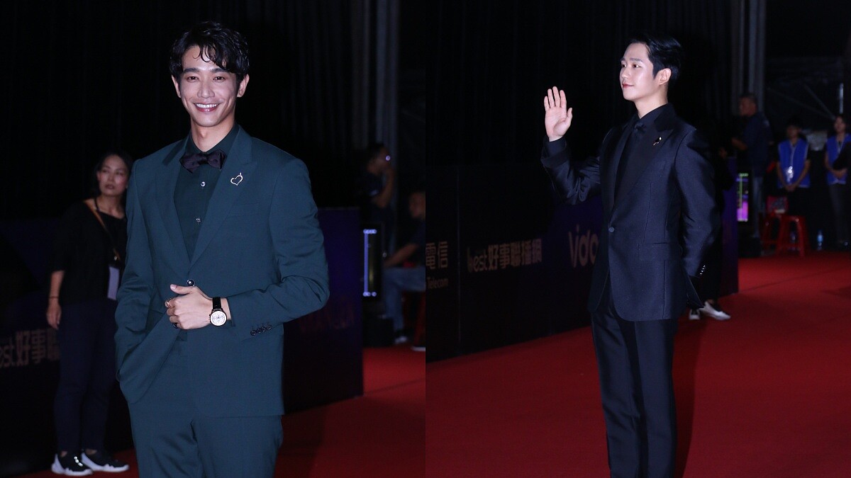 男明星則包含擔任表演嘉賓的周興哲,身著DIOR白色經典襯衫及深藍色晚禮服套裝,外頭搭配灰色科技布料網格戰鬥背心,是不是一下禮車就讓人眼睛為之一亮。張軒睿則以Paul Smith氣質滿點的綠色絨布單釦西裝,搭配同色系西裝褲與白色緹花襯衫,腳踩Tod's正是鞋款,呈現帥氣清新的英倫氣息。黃鴻升與KID一同走紅毯,許久未有代表作品的小鬼黃鴻升今日的小平頭造型看起來相當清爽。久未合體的浩角翔起,則是搭檔亂彈阿翔一起走上星光大道,三人互動十分逗趣,造型也極具巧思。
