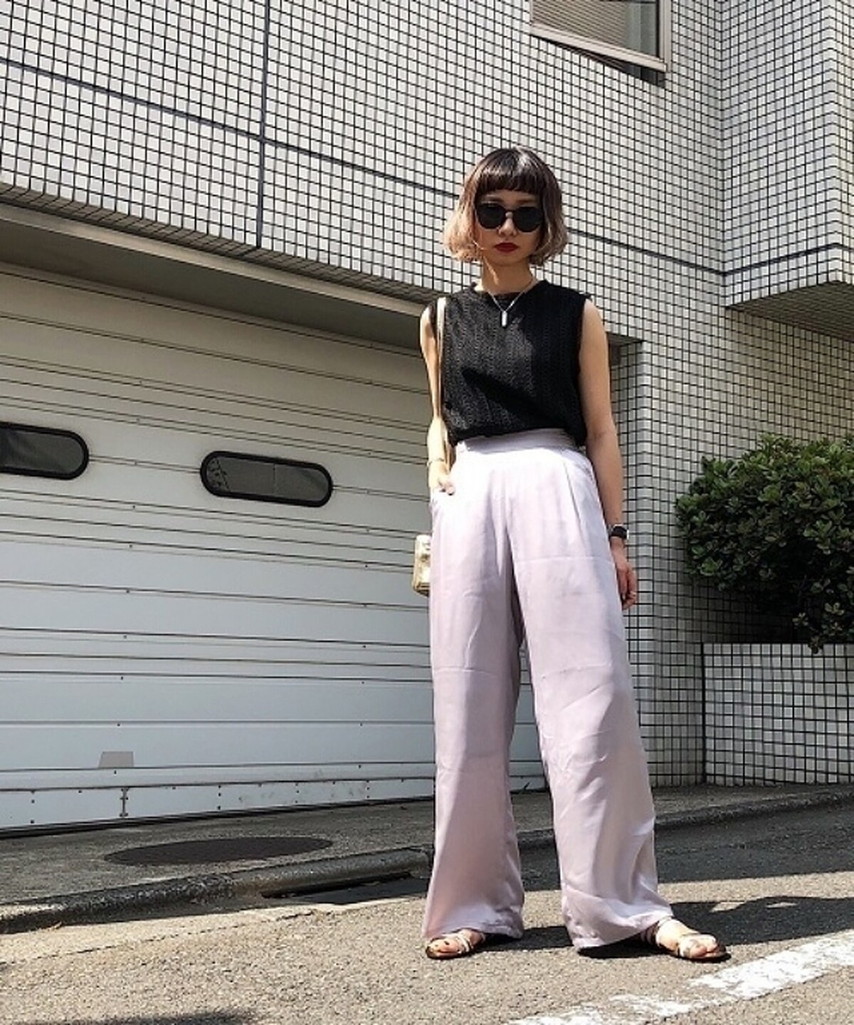 面對早晚溫差較大的秋天,白天外出時想營造涼爽風格的話,選擇背心與緞面感長褲混搭,透過淺色調的米白或粉紫,連結幾分清新女孩的造型氣息,再踏上平底拖鞋便能輕鬆出門。