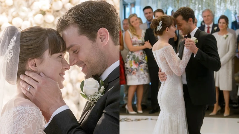 而早在先前,Monique Lhuillier的婚紗便已是許多歐美名人的首選,尤其在《格雷的五十道色戒》第三集中,女主角Dakota Johnson一幕結婚的畫面便是身著出自Monique Lhuillier的婚紗。一字領的露肩婚紗配上精緻的雕花透膚長袖與魚尾裙擺,盡顯性感優雅的一面。