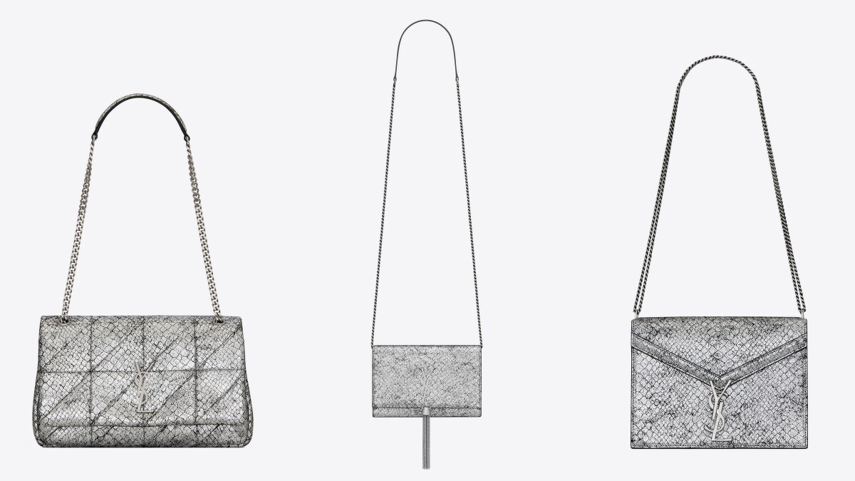 想到聖誕節便會想到雪白的世界,而Saint Laurent就為此推出了Christmas Capsule特別系列,將銀鋁般的低調閃爍質地壓印於蛇紋皮革上,搭載銀色鍊墜和Logo標誌,體現冬日裡的璀璨光芒。然而無論是喜愛CASSANDRA系列和JAMIE軟包,又或是KATE和SUNSE等經典包款,都可在此系列中找尋到喔!
