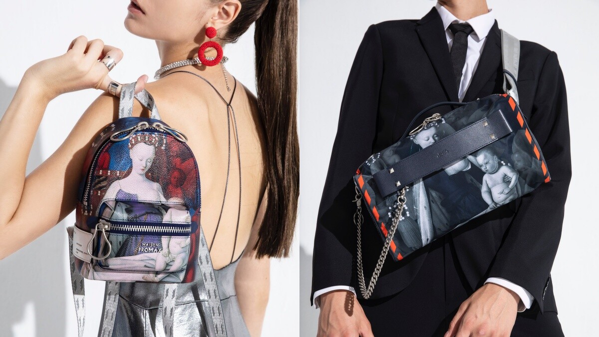 以後背包為名的法國手袋品牌Maison Promax,在今年的聖誕系列中將法國宮廷畫家Jean Fouquet於1452年繪製的《聖母子》畫像取用至了手袋上,這副由查理七世的財政大臣夏瓦力委託的畫作,將當時法國公認第一美的阿涅絲‧索雷爾,也就是夏瓦力的情婦作為畫作主角,而Jean Fouquet更將阿涅絲‧索雷爾那大膽且前衛的穿衣風格巧妙演繹於上,好比漏出半邊乳房的造型,彷彿剛餵哺完小耶穌班和諧且慈祥。另外,身後的天使則分別染上了查理七世紋章的紅、藍兩色,隱喻她王后般的尊寵地位。Maison Promax的聖誕系列除了有彩色款,也有酷炫的黑白色搭載紅色編織紋供選擇。