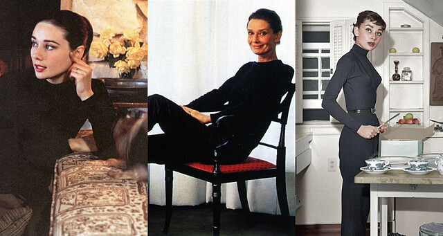 要說到黑色高領的代表人物,勢必就是比傳奇更傳奇的「奧黛麗赫本」了,赫本是黑色上衣的信徒,不但一路穿到老年,在許多電影或生活造型中都時常出現它的身影,最經典的就是黑色高領配黑褲,如此極簡卻就已經像是精心打扮過。