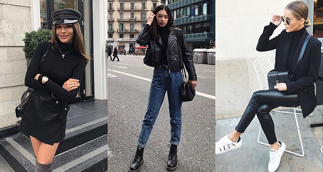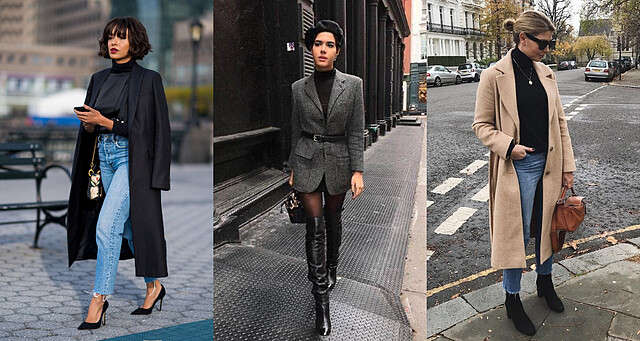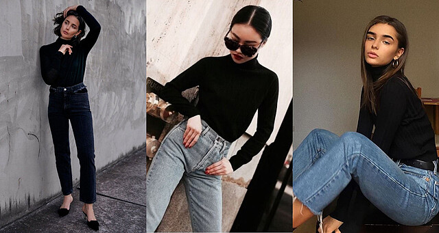 一件黑色高領搭上牛仔褲,縱使簡約也沒有任何飾品加持,依然能讓穿搭散發精緻感,也降低了牛仔褲的休閒感,建議搭配直筒或 MOM JEANS 更有復古美,並利用不同鞋款展現不同風格,配上高跟鞋或尖頭皮鞋就是很體面的上班穿搭,下班換成球鞋、帆布鞋就能立刻轉換成休閒風,很適合下班後要去約會、逛街的組合。