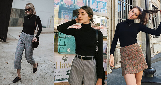 秋冬必備元素格紋與黑色高領也是絕配,不論是格紋褲還是格紋裙,都能被黑色高領帶出知性美優雅不已,隨意踩上穆勒鞋舉手都足都是不經意的率性。