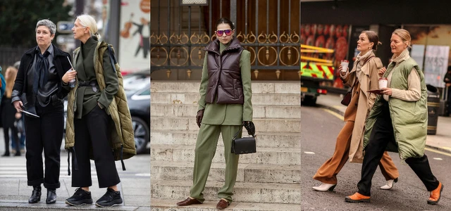 羽絨款式還有背心可以選擇,但要怎麼避免穿得像叔伯輩的樣子,就得費點心思了。長度上可以挑比較長版的,拉長身形且少了袖子讓視覺看起來更加輕盈,內搭像是圖左的西裝外套,內外風格迥異成為焦點;圖右是無領背心,內搭了高領針織上衣,填補了頸脖處的空隙,增添上身份量。