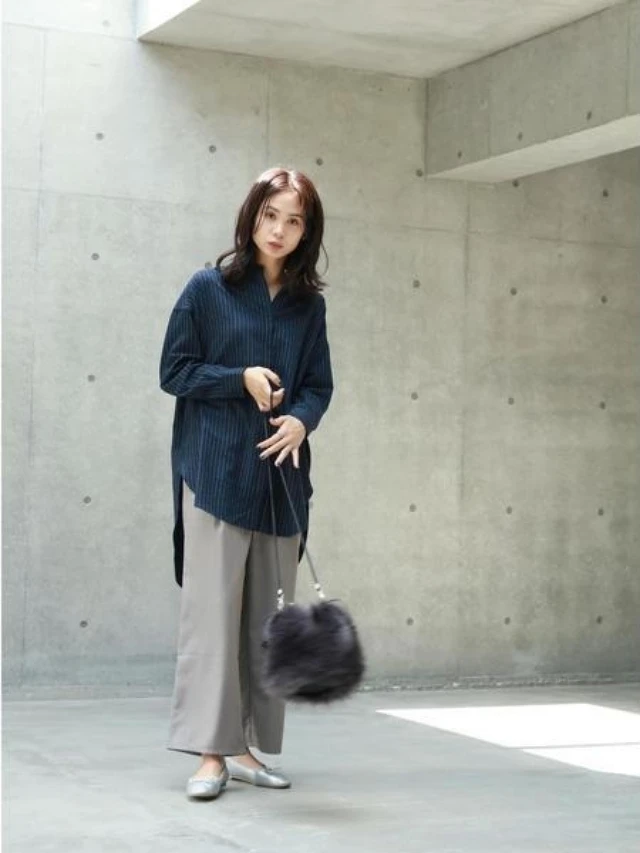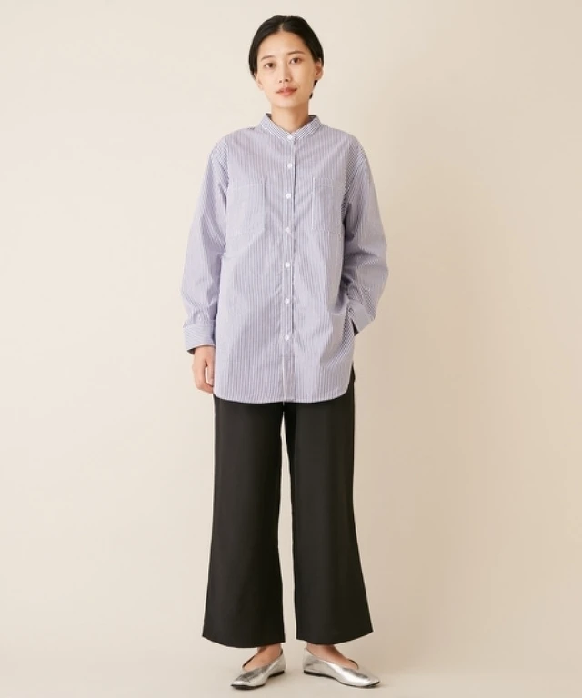 立領造型的條紋襯衫,能使衣著提升成熟穩重的大人感氣息,利用 oversize 設計可削弱襯衫給人的呆板印象,以立領條紋襯衫混搭九分寬褲,連結中性休閒的時尚 Look ,再踏上平底鞋使上班族穿搭輕鬆又自在。