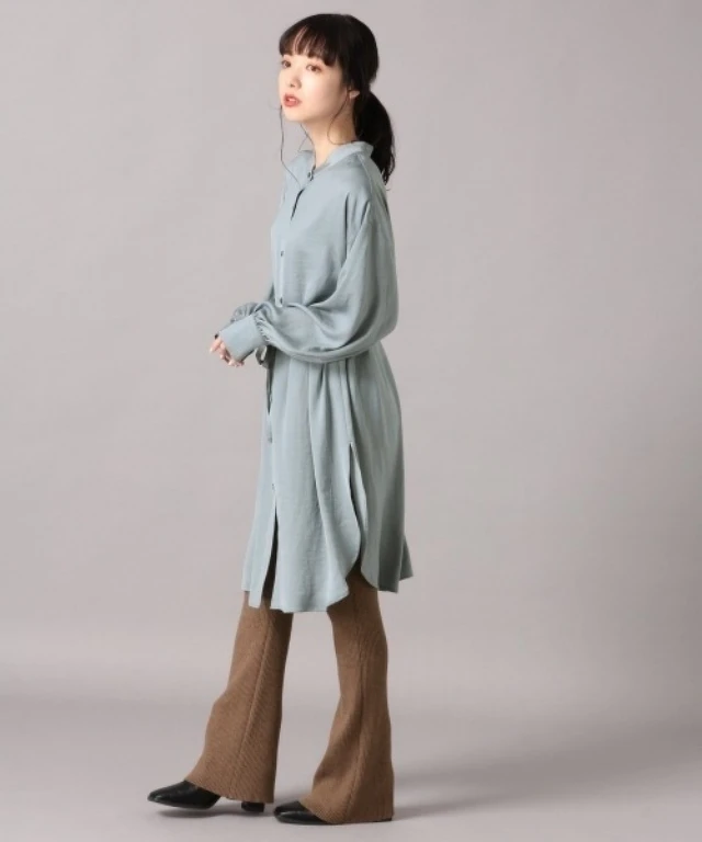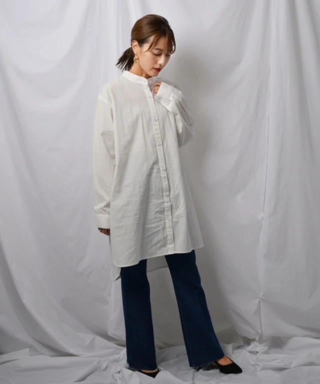 長版剪裁素面襯衫融入柔軟手感的面料,使正式感的襯衫意外製造知性風格魅力,將長版襯衫與針織長褲混搭,為造型連結簡單大方的溫柔形象,不論是穿搭高跟鞋或短靴,瞬間打造迷人聚焦的日系質感。