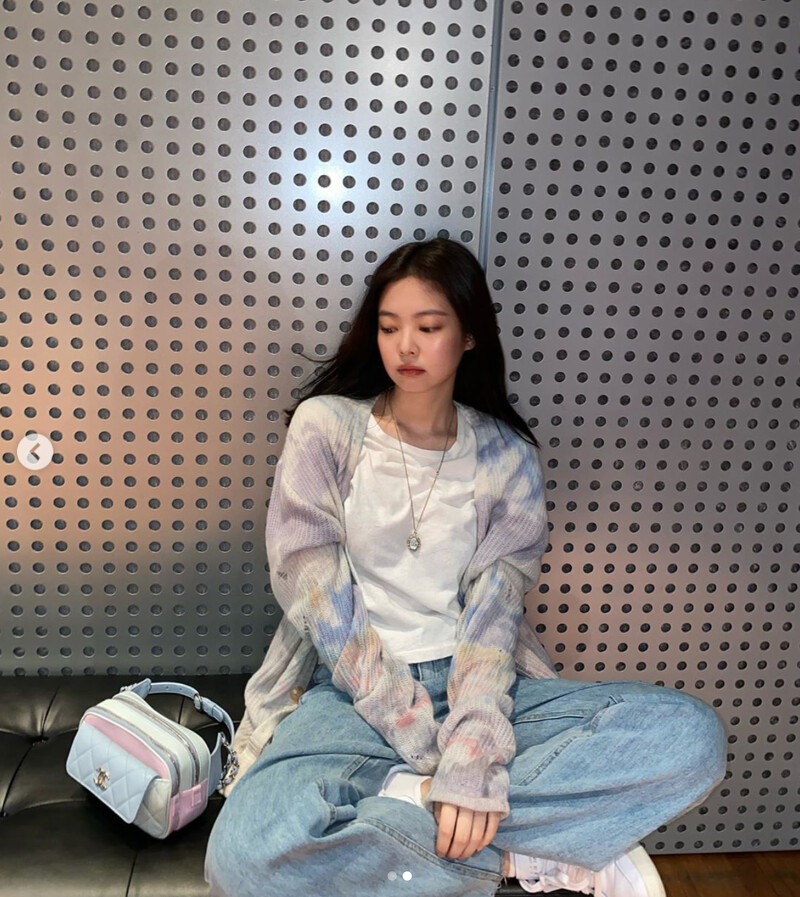 Jennie近日與團員私下玩樂時拍下的私服OOTD,5連拍中她穿著AMIRI棉花糖色的紮染針織衫配牛仔褲與adidas Originals小白鞋,青春又甜美,她也不負「人間香奈兒」稱號,放在一旁的香奈兒腰包,立刻引起廣大討論。