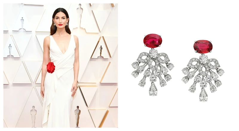BVLGARI 品牌大使、同時也是星光紅毯主持人之一的 Lily Aldridge,腰間點綴了一朵紅花朵的白色禮服相當清新脫俗,正好呼應她簡約的妝容與大紅唇,再配戴 BVLGARI 頂級紅寶石與鑽石耳環,不過份搶眼卻完美展現出身材與氣質優勢,低調而亮眼,做為紅毯主持人相當得體。