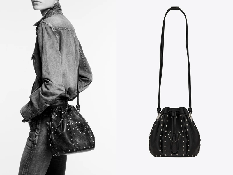 Saint Laurent這款水桶包有鉚釘點綴出招牌的個性風格,但在水桶包正中央以心形皮革鏤空拼貼呈現,叛逆但不失純真女孩心的設計風格,比單純反叛更加吸引人。