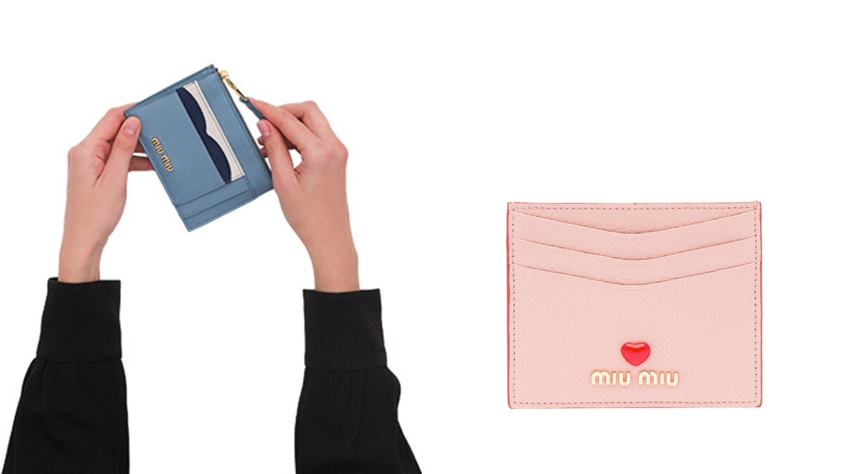 7.miu miu MADRAS COLOUR皮革卡片套,NT8,600(左)/ MADRAS LOVE 信用卡夾,NT7,800(右)