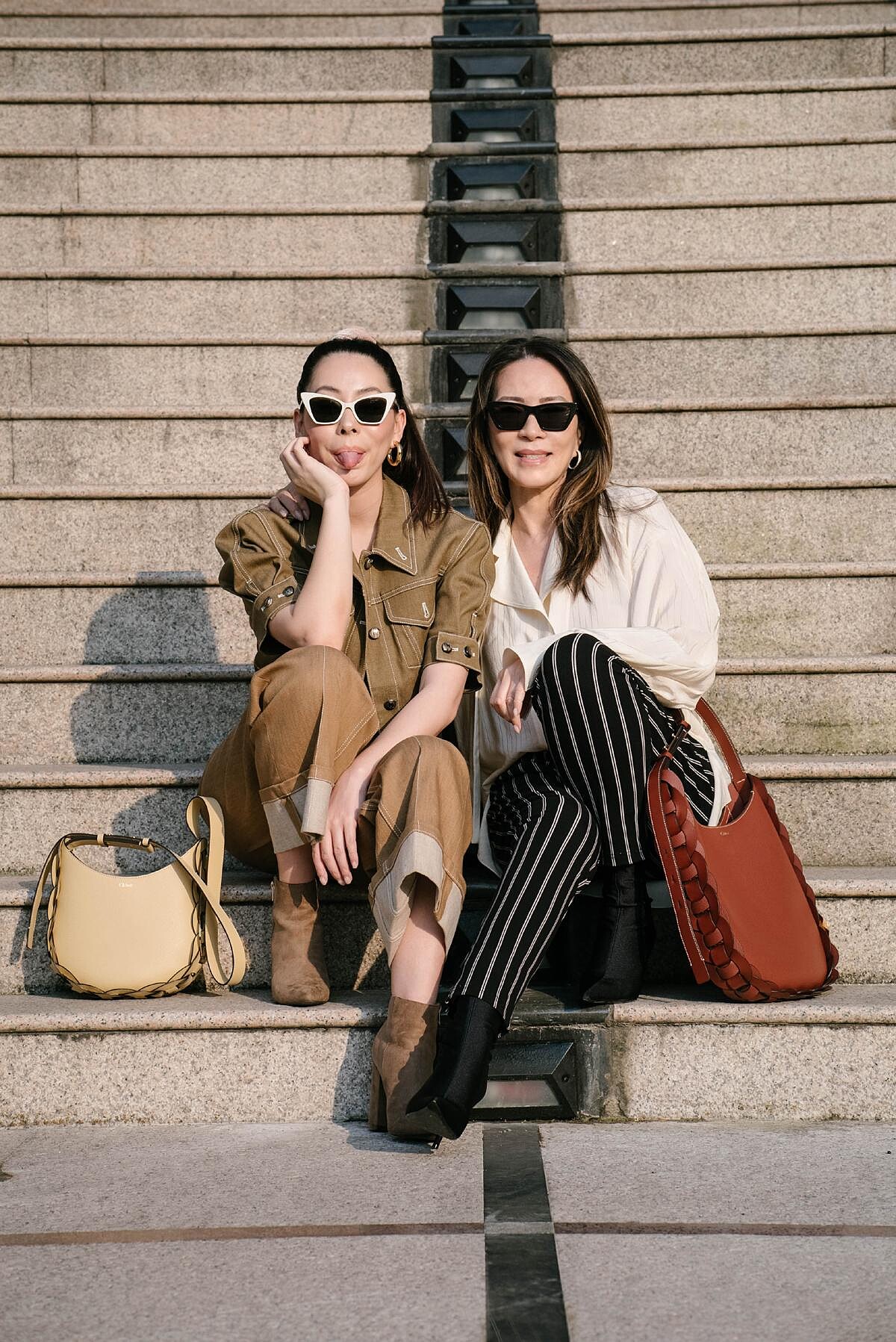 孫芸芸與女兒 Trinity 廖思惟兩人一起享受穿搭樂趣:以Chloé Daria Bag為重點配件,孫芸芸拿焦糖棕大尺寸、女兒 Trinity 拎寶寶藍小尺寸,再穿上短褲、西部靴,詮釋帥氣性感的風格。