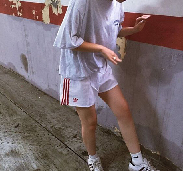 Oversized T-shirt 不一定要搭配牛仔短褲,可以嘗試運動風格的膝上短褲,沒有單車褲貼腿,修飾效果與比例卻出乎意料地好。