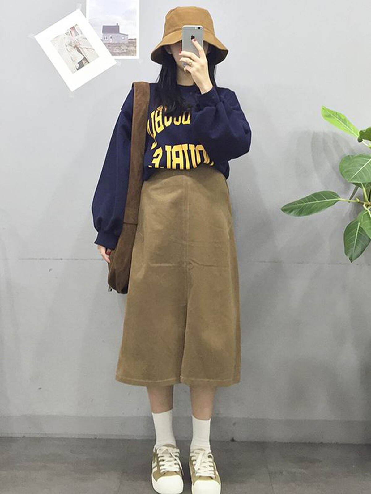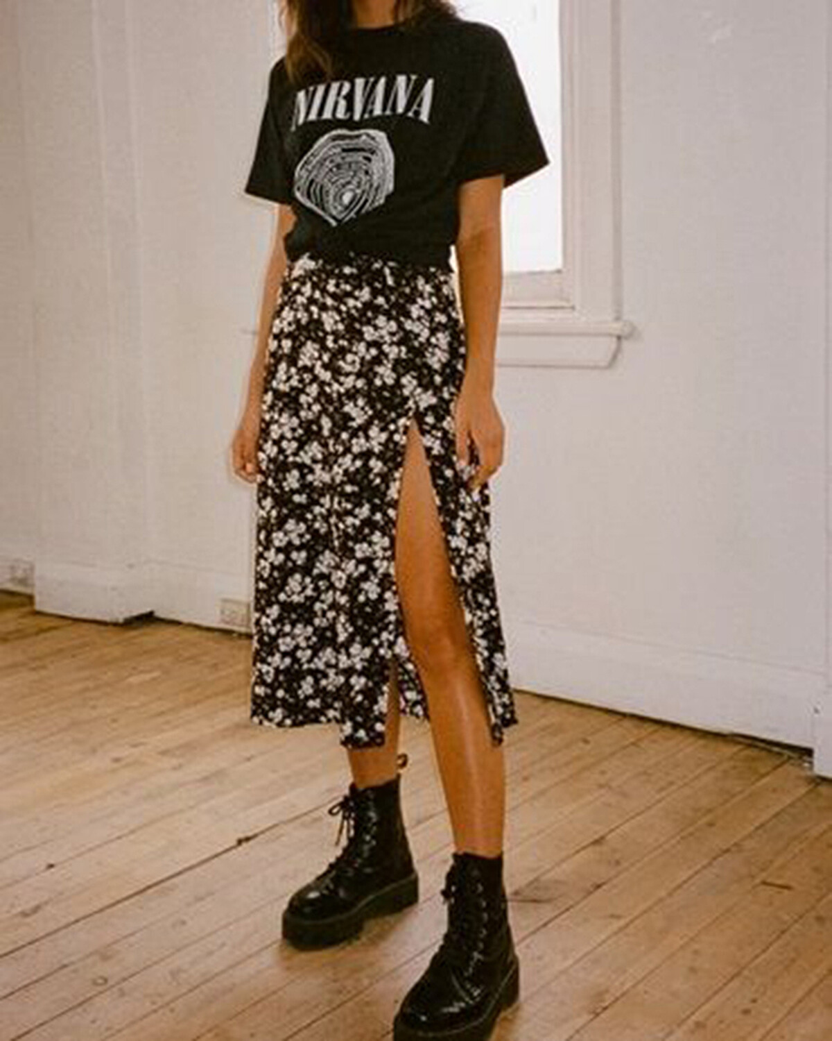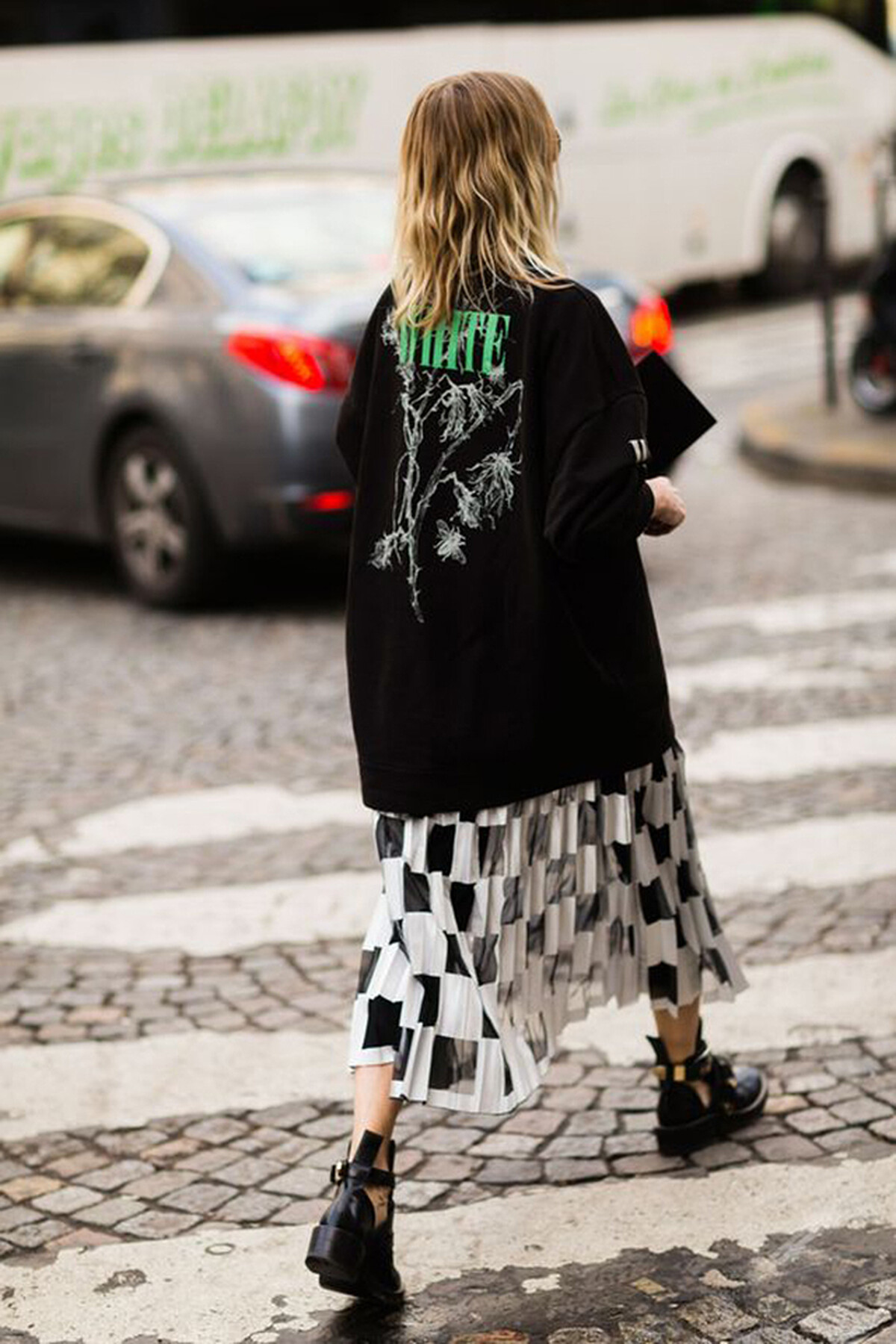 Oversized T-shirt 搭配短裙時特別有學生感,不出錯的選擇是搭配較窄的裙,如果想避免太過青春洋溢的形象,可以穿著較有設計感的裙裝,或者是挑選有別於柔軟棉質的其他材質與成熟的花紋。