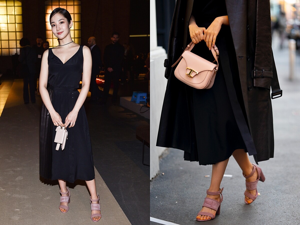女神朴敏英身為 Tod's 品牌大使,早在 2 月前往時裝週看秀時,就已經搶先穿上春夏新款編織涼鞋,搶先一步展現春夏流行趨勢。女神著用的這款,復古的粗跟設計,走起路來絕對穩,高跟鞋初學者就該選擇這種款式!三帶設計的鞋面,最中央有近年來最具標誌性的 Double T 圖樣,麂皮結合編織的細節,讓視覺層次感更豐富。