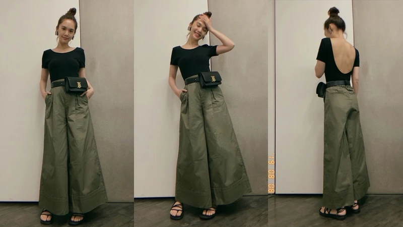接下來要告訴大家的是進階班!想微露性感卻不要太超過,那這件軍綠色寬褲搭配黑色挖背上衣,可以成為下一次穿搭的靈感。高腰硬挺材質的軍綠色寬褲,完美修飾了女孩在意的大腿、臀部,同時顯現腰部的纖細,而挖背上衣完美吸引眾人目光,展現女人的小性感。