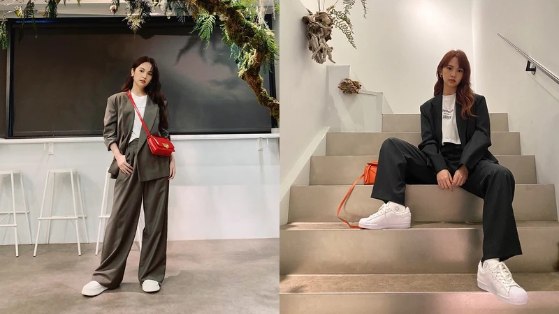 近年來,上、下身同色的西裝式套裝再成為趨勢,不論歐美街拍、韓劇穿搭中大量出現,同色系的正式裝扮看起來俐落、帥氣,非常適合OL作為上班穿搭。在搭配服裝的時候,可以選擇米色、棕色、黑色等好駕馭的色選,若不想要整體看起來太過於沉悶,那不妨學學楊丞琳搭配短版上衣、球鞋等。