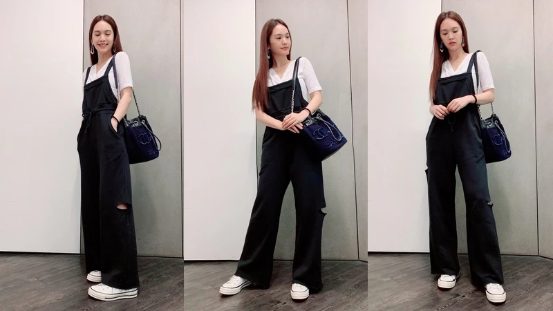 同樣是吊帶寬褲款式,不同的地方在於腰部的抽繩設計,能突顯腰身讓身形看起來更瘦,切記肉肉女孩不宜選擇,這樣的穿搭法比較適合骨感女生。平口吊帶褲搭配V字領上衣為整體增添亮點,在選擇單品的時候,像是側邊割破設計這些小巧思十分重要。