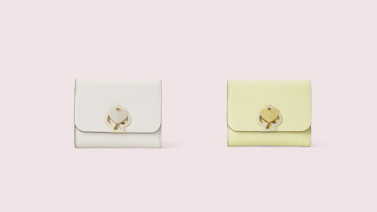 來自紐約的Kate Spade,以樂觀、正向並充滿歡樂氣氛為品牌宗旨,最新登場的短夾便以品牌標誌「黑桃」圖案作為旋釦機關,每次在旋轉開合的時候,黑桃與心型隨著開合而變換,三折式的錢包設計,可以放置鈔票、卡片及零錢,除了氣質米白色,還推出粉嫩的鵝黃色選。經典旋釦皮夾,NT6,500